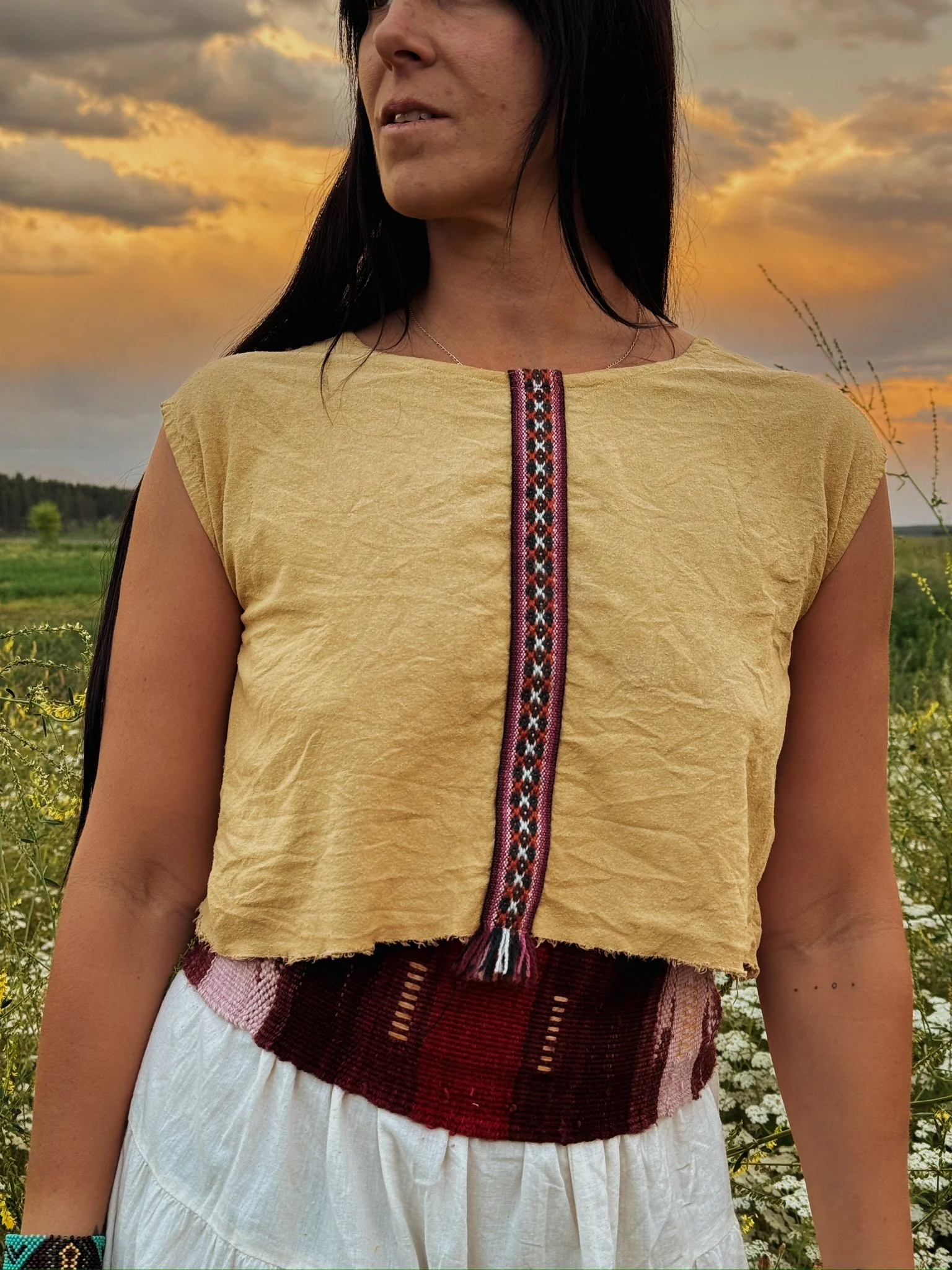 Late Summer: Raw silk hand dyed with Coreopsis adorned with a Peruvian woven XS/S $120
